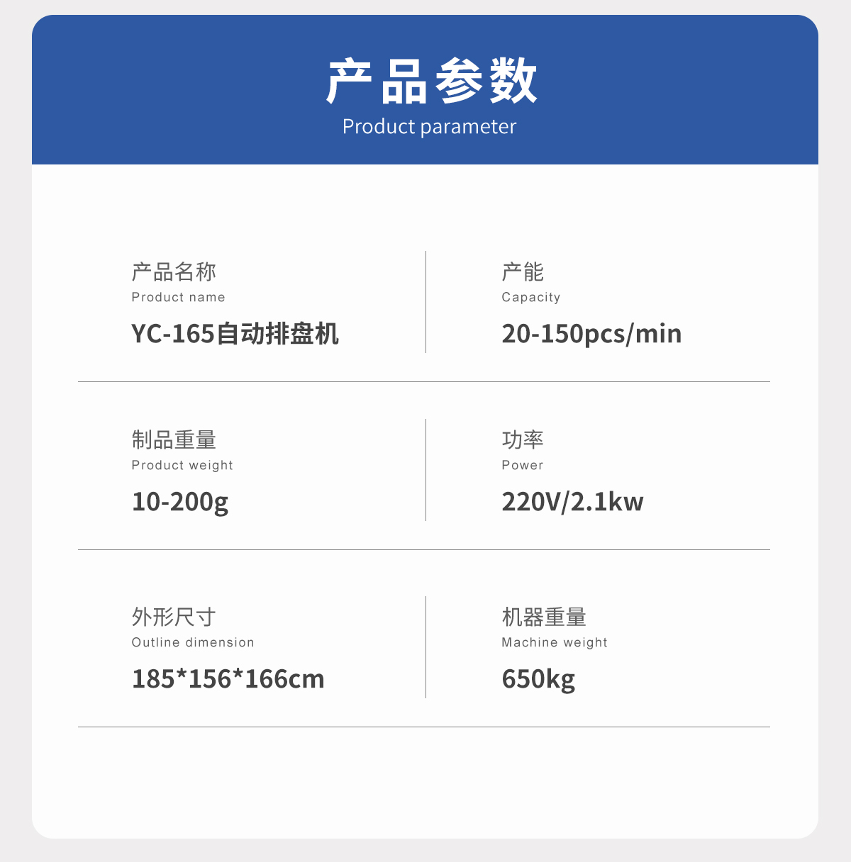 型號 | YC-165 | 產能 | 1-150個/分鐘 |