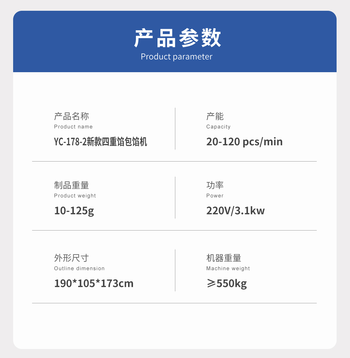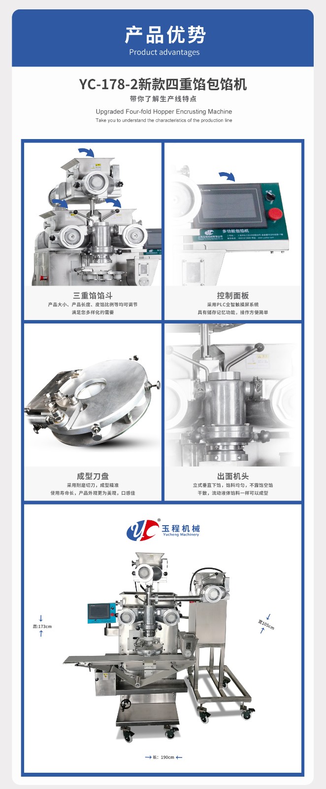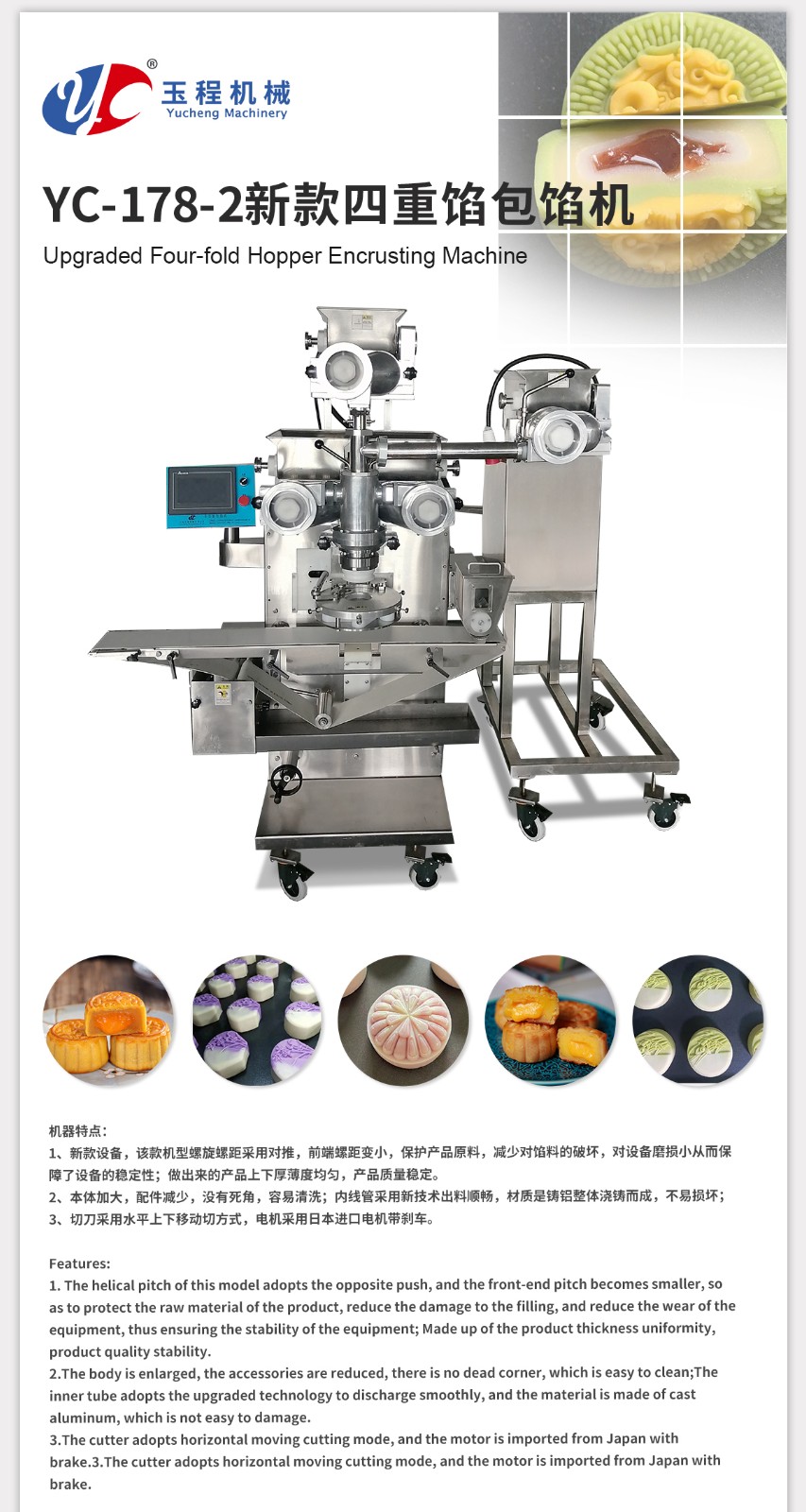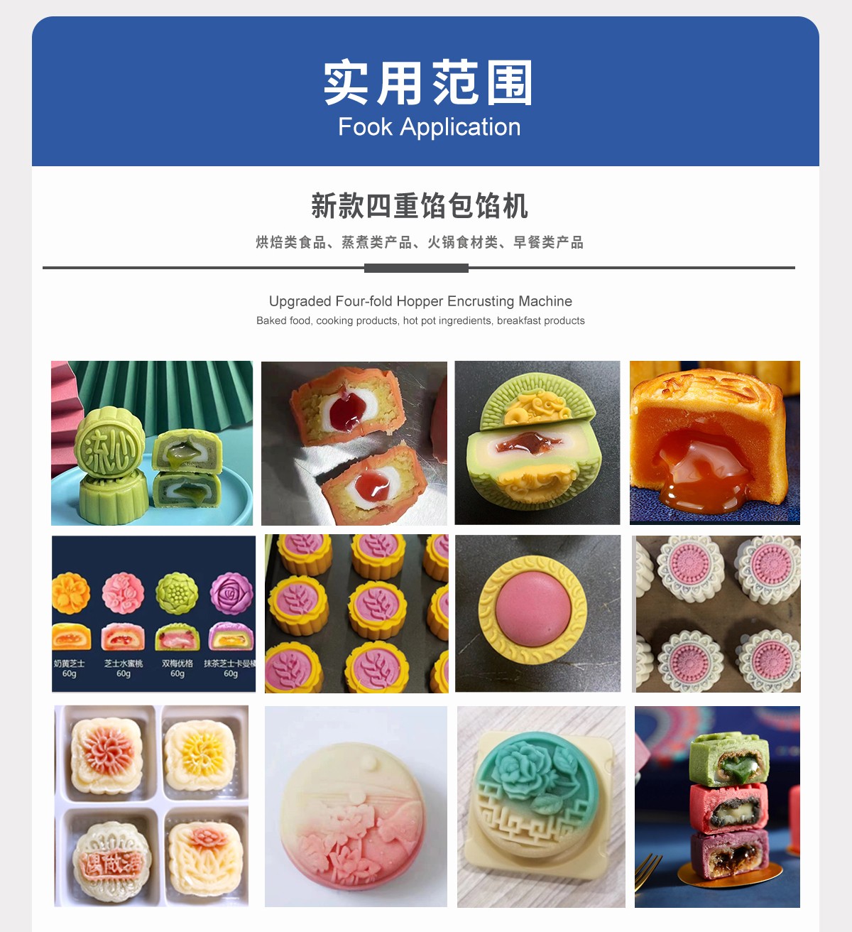 可適用于:烘焙類產品、魚漿類產品、早餐類產品、蒸煮類產品d等,另可生產四重包餡產品如:四重流心月餅、漸變色流心月餅、雙色和果子、金鑲玉月餅。