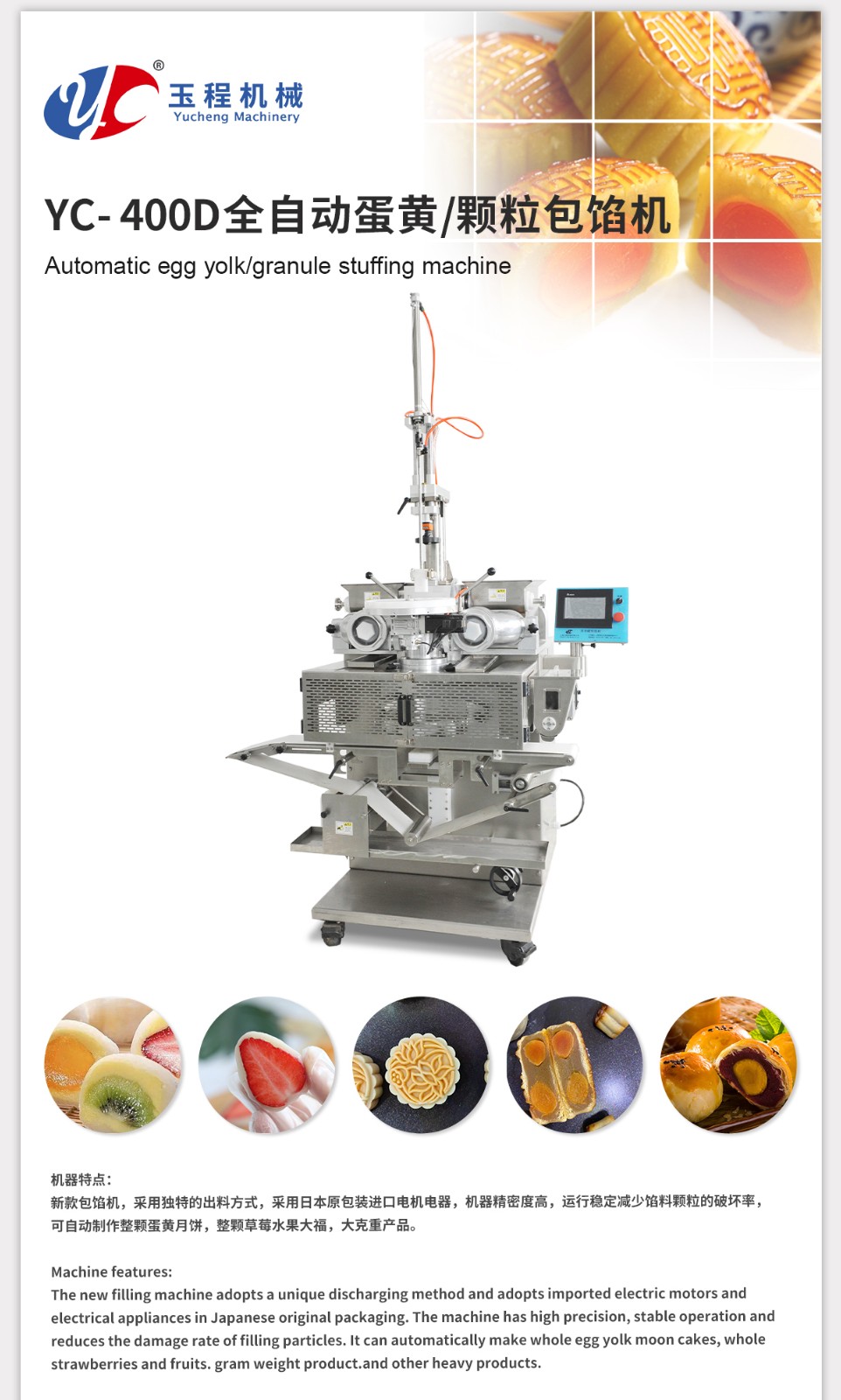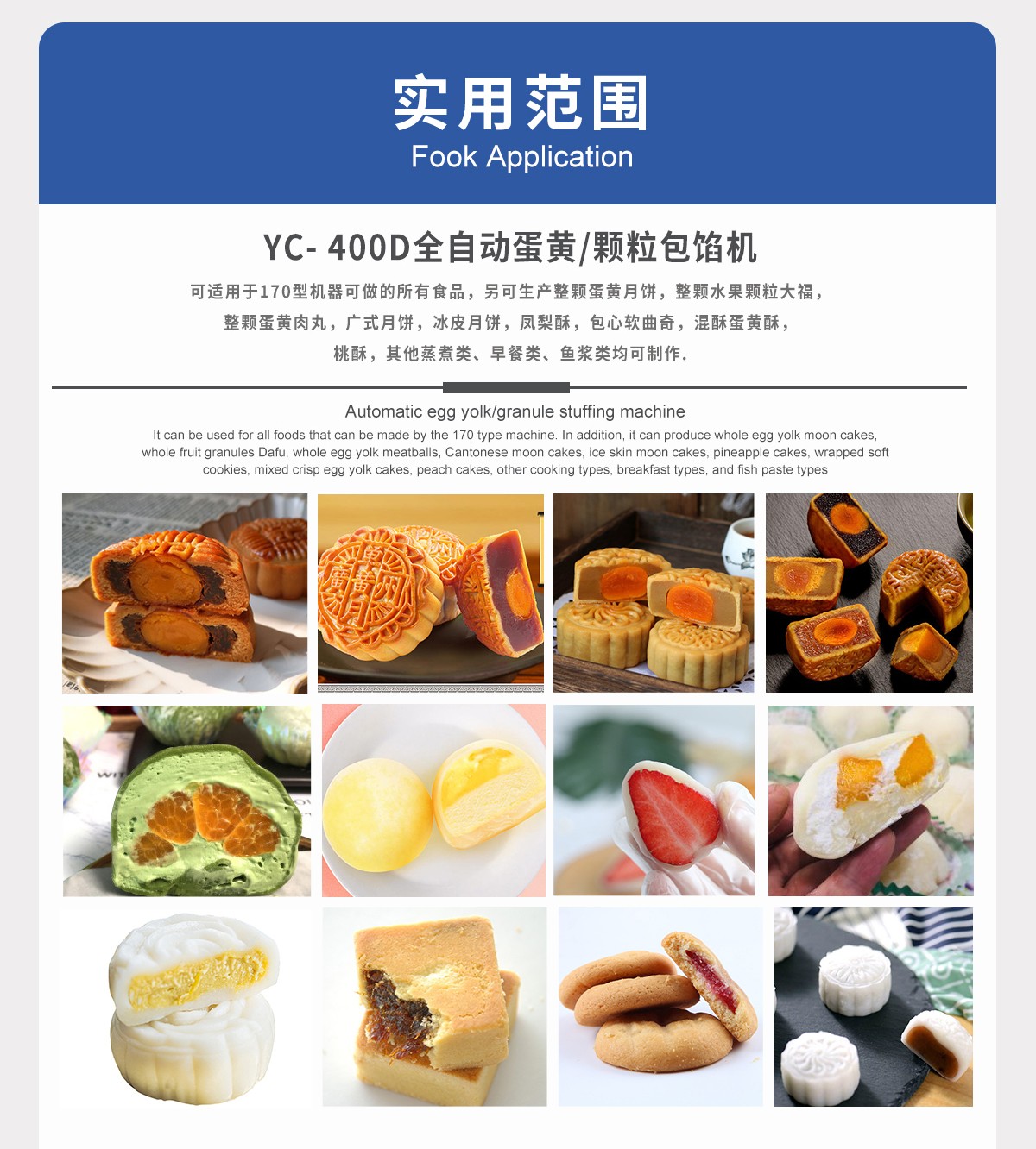 可適用于:生產整顆蛋黃月餅,整顆水果顆粒大福,整顆蛋黃肉丸,廣式月餅,冰皮月餅,鳳梨酥,包心軟曲奇,混酥蛋黃酥,桃酥,其他蒸煮類、早餐類、魚漿類均可制作.