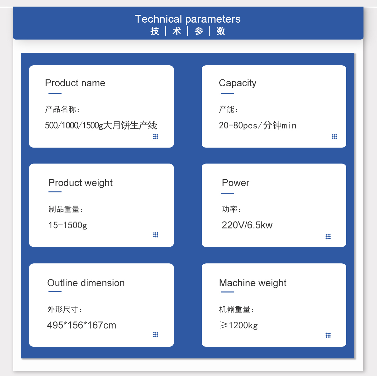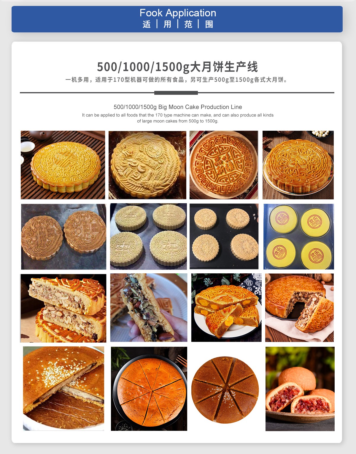 適用于:500g大月餅,1000g大月餅,1500g大月餅等烘烤類產(chǎn)品,蒸煮類產(chǎn)品,早餐類產(chǎn)品等。